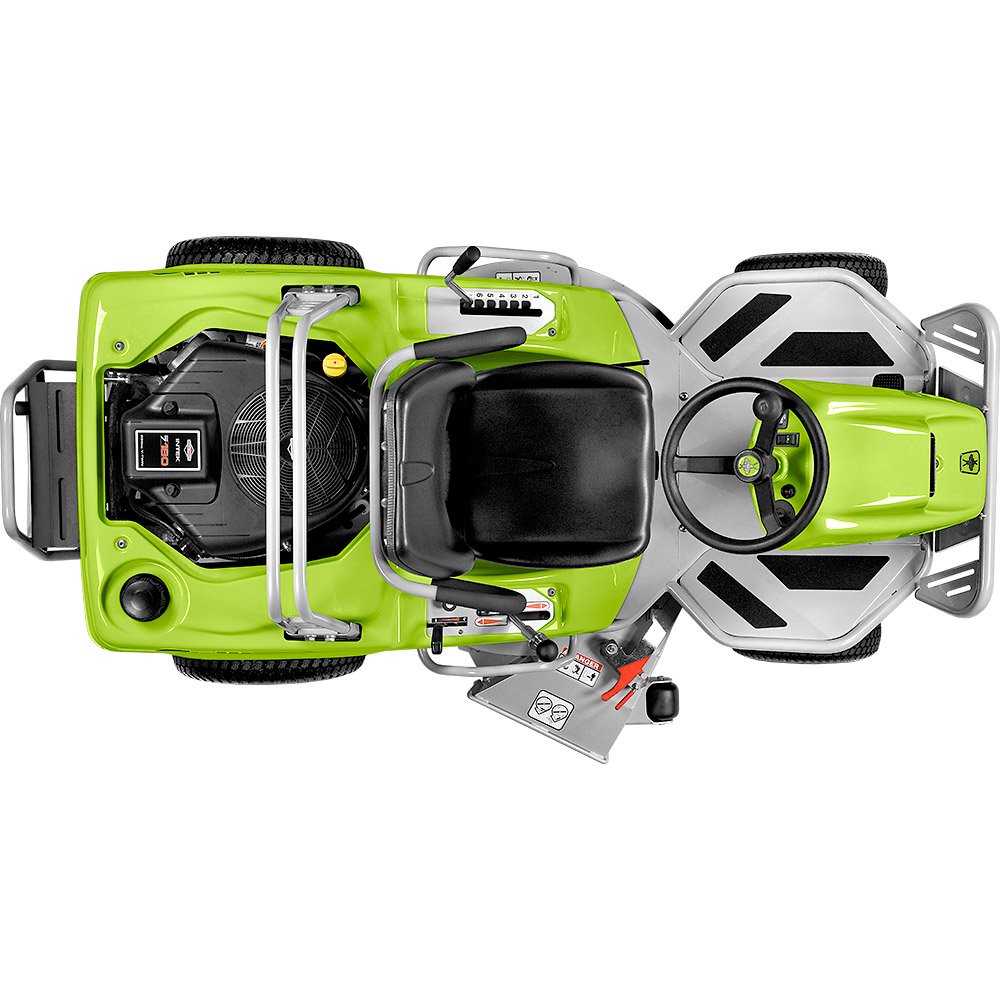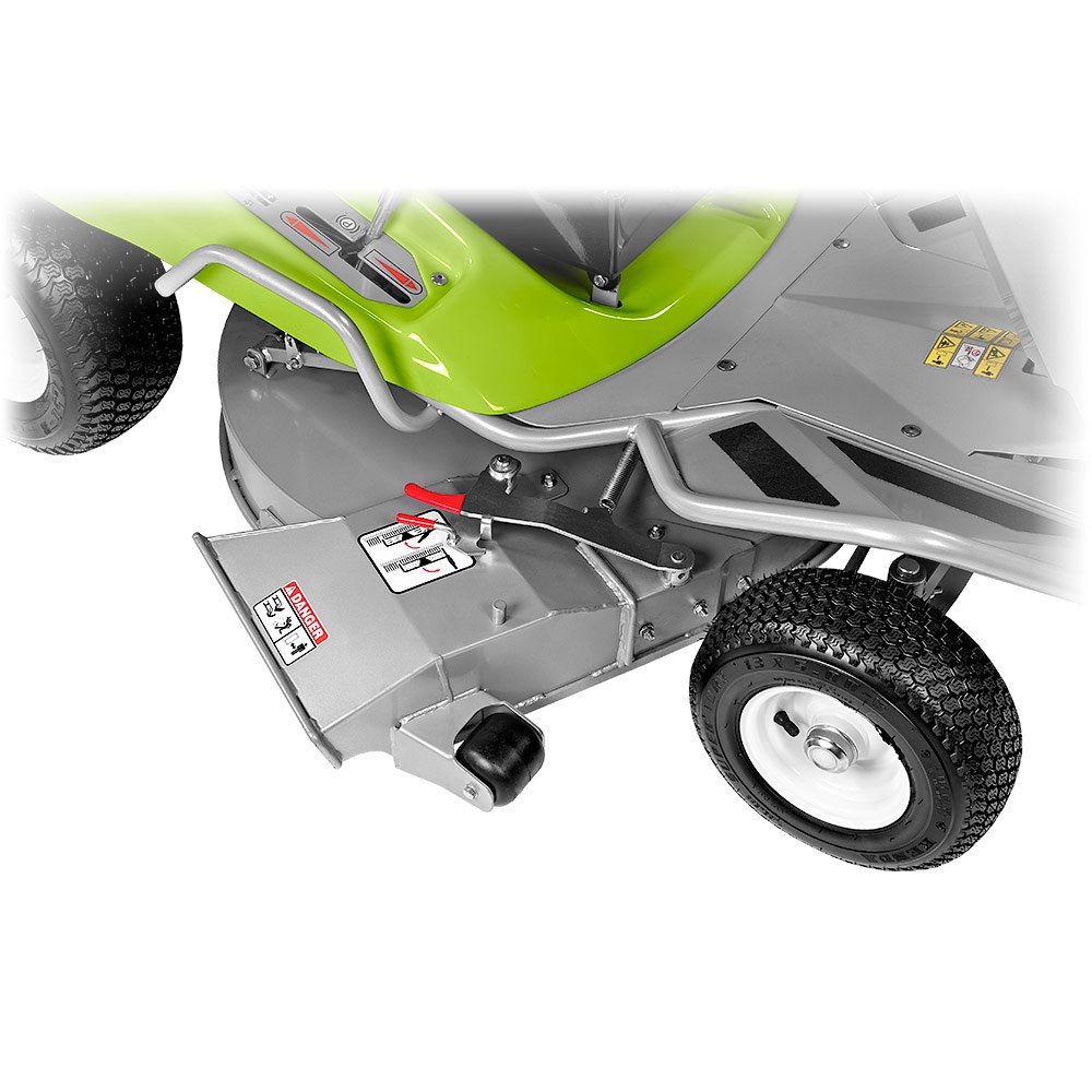 La hauteur de coupe va de 2,5 à 8 cm et s’effectue au moyen d’un levier à 6 positions. Ce même levier dispose d’une position de transfert supplémentaire qui permet de soulever l’ensemble du dispositif de coupe du sol, en arrêtant automatiquement la rotation des lames pour franchir aisément les bordures et les obstacles.